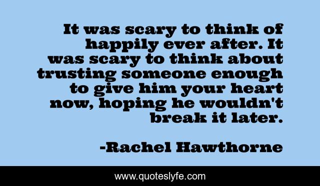 This page presents the quote "It was scary to think of happily ever after. It was scary to think about trusting someone enough to give him your heart now, hoping he wouldn't break it later.". Author of this quote is Rachel Hawthorne. This quote is about snowed-in, romance-novels,.