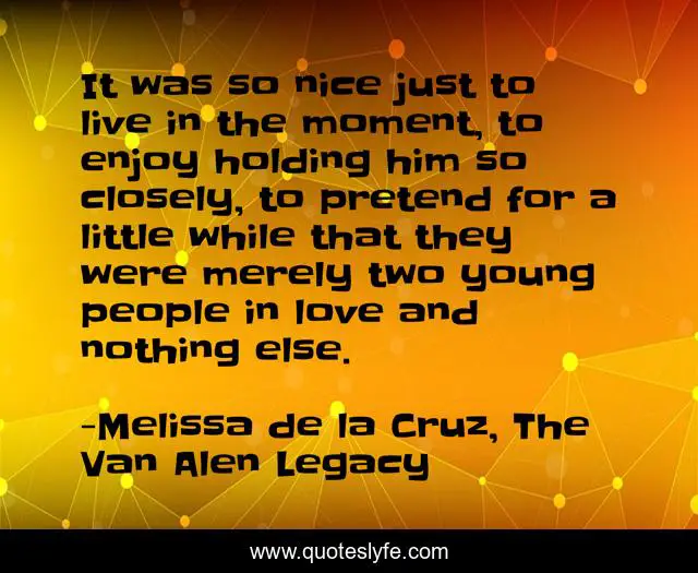 This page presents the quote "It was so nice just to live in the moment, to enjoy holding him so closely, to pretend for a little while that they were merely two young people in love and nothing else.". Author of this quote is Melissa de la Cruz, The Van Alen Legacy. This quote is about life, love, pretend, moment, holding-on, in-love, affection,.