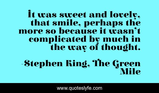 This page presents the quote "It was sweet and lovely, that smile, perhaps the more so because it wasn’t complicated by much in the way of thought.". Author of this quote is Stephen King, The Green Mile. This quote is about smile, happiness,.