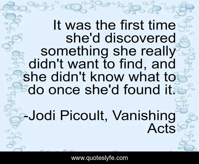 This page presents the quote "It was the first time she'd discovered something she really didn't want to find, and she didn't know what to do once she'd found it.". Author of this quote is Jodi Picoult, Vanishing Acts. This quote is about find, discovery,.