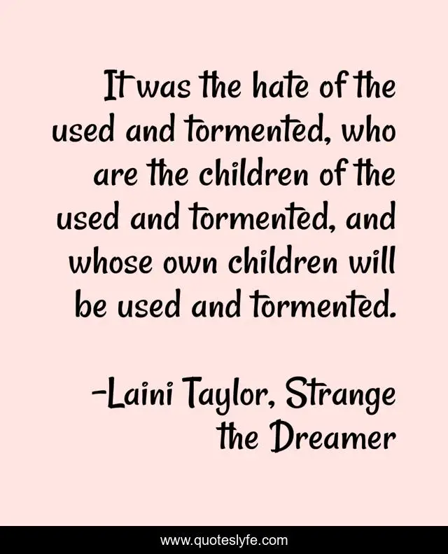 This page presents the quote "It was the hate of the used and tormented, who are the children of the used and tormented, and whose own children will be used and tormented.". Author of this quote is Laini Taylor, Strange the Dreamer. This quote is about growing-up, humanity,.