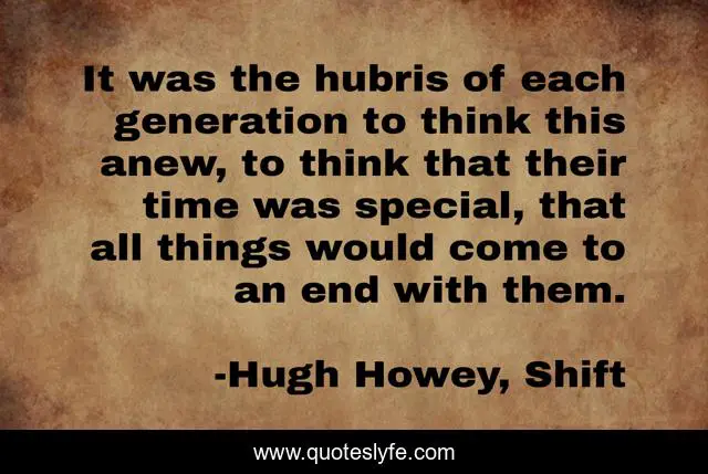 This page presents the quote "It was the hubris of each generation to think this anew, to think that their time was special, that all things would come to an end with them.". Author of this quote is Hugh Howey, Shift. .