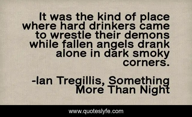 This page presents the quote "It was the kind of place where hard drinkers came to wrestle their demons while fallen angels drank alone in dark smoky corners.". Author of this quote is Ian Tregillis, Something More Than Night. This quote is about angels, demons,.