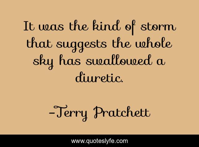 This page presents the quote "It was the kind of storm that suggests the whole sky has swallowed a diuretic.". Author of this quote is Terry Pratchett. This quote is about funny, humor, diarrhea, rain, weather, storm, comedy,.