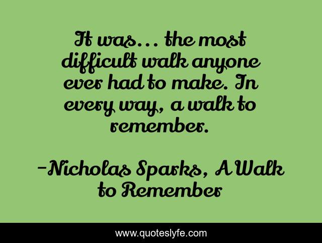 "Nicholas Sparks, A Walk to Remember Quotes." Quoteslyfe.com, 2025. Sun. 07 Dec. 2025. <https://www.quoteslyfe.com/quote/It-was-the-most-difficult-walk-anyone-224031>.
