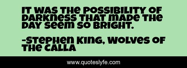 This page presents the quote "It was the possibility of darkness that made the day seem so bright.". Author of this quote is Stephen King, Wolves of the Calla. This quote is about dark, bright, day, night,.