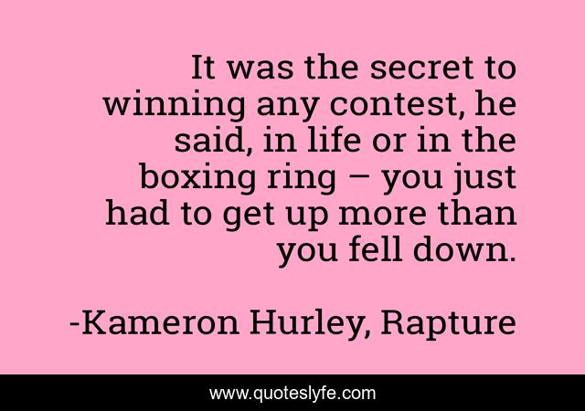 This page presents the quote "It was the secret to winning any contest, he said, in life or in the boxing ring – you just had to get up more than you fell down.". Author of this quote is Kameron Hurley, Rapture. This quote is about life, contest, winning,.