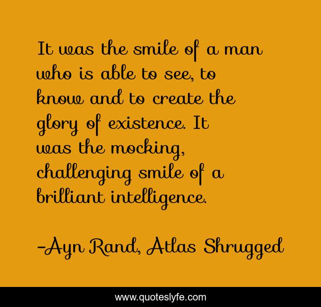 This page presents the quote "It was the smile of a man who is able to see, to know and to create the glory of existence. It was the mocking, challenging smile of a brilliant intelligence.". Author of this quote is Ayn Rand, Atlas Shrugged. This quote is about intelligence, atlas-shrugged, happiness, smile,.