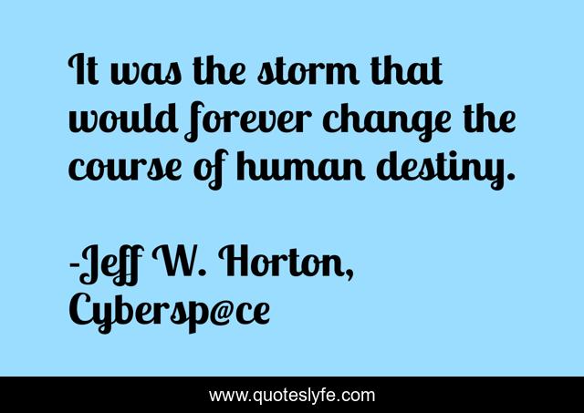 This page presents the quote "It was the storm that would forever change the course of human destiny.". Author of this quote is Jeff W. Horton, Cybersp@ce. This quote is about cyber-warfare, cybersp-ce, science-fiction, techno-thriller,.