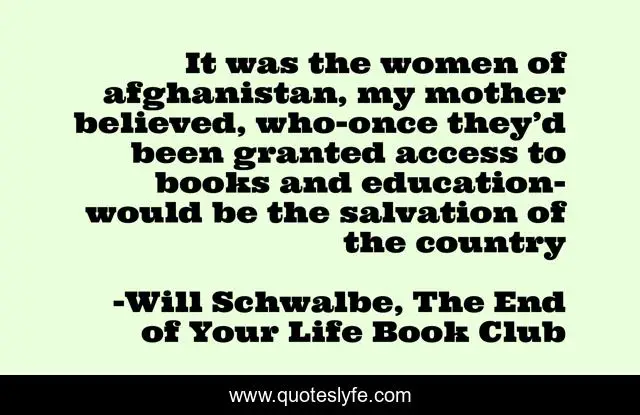 This page presents the quote "It was the women of afghanistan, my mother believed, who-once they’d been granted access to books and education- would be the salvation of the country". Author of this quote is Will Schwalbe, The End of Your Life Book Club. .