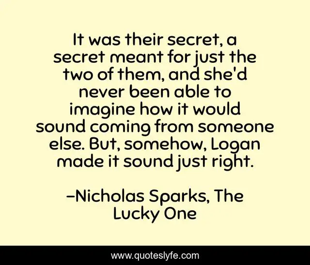 This page presents the quote "It was their secret, a secret meant for just the two of them, and she'd never been able to imagine how it would sound coming from someone else. But, somehow, Logan made it sound just right.". Author of this quote is Nicholas Sparks, The Lucky One. This quote is about happiness, love, hope, affection,.