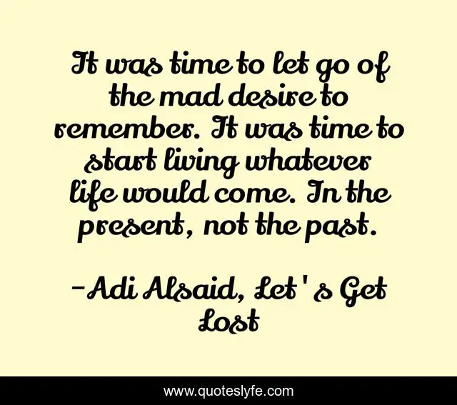 This page presents the quote "It was time to let go of the mad desire to remember. It was time to start living whatever life would come. In the present, not the past.". Author of this quote is Adi Alsaid, Let's Get Lost. This quote is about enthusiasm, hope, inspirational,.