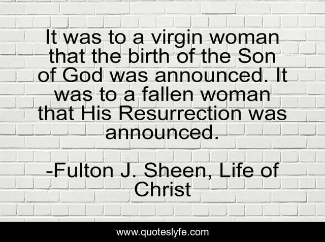 This page presents the quote "It was to a virgin woman that the birth of the Son of God was announced. It was to a fallen woman that His Resurrection was announced.". Author of this quote is Fulton J. Sheen, Life of Christ. This quote is about virgin-mary, mary-magdalen, jesus,.