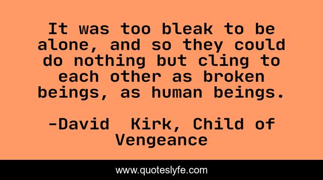This page presents the quote "It was too bleak to be alone, and so they could do nothing but cling to each other as broken beings, as human beings.". Author of this quote is David Kirk, Child of Vengeance. .