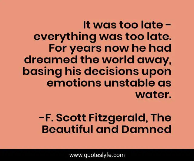 This page presents the quote "It was too late - everything was too late. For years now he had dreamed the world away, basing his decisions upon emotions unstable as water.". Author of this quote is F. Scott Fitzgerald, The Beautiful and Damned. This quote is about anthony-patch, life-and-living, decisions, choices,.
