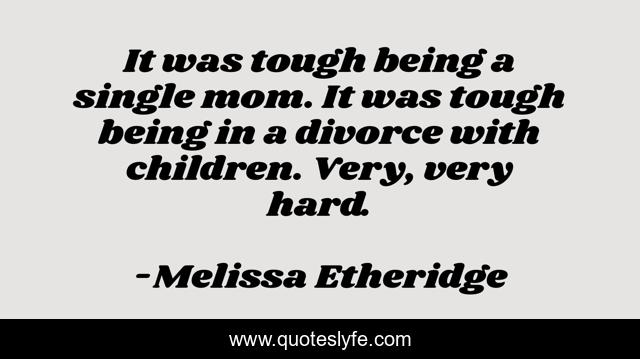 This page presents the quote "It was tough being a single mom. It was tough being in a divorce with children. Very, very hard.". Author of this quote is Melissa Etheridge. This quote is about divorce, single, children,.