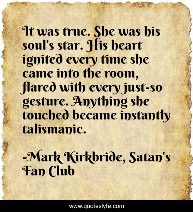 This page presents the quote "It was true. She was his soul’s star. His heart ignited every time she came into the room, flared with every just-so gesture. Anything she touched became instantly talismanic.". Author of this quote is Mark Kirkbride, Satan's Fan Club. This quote is about horror-story, love, affection,.