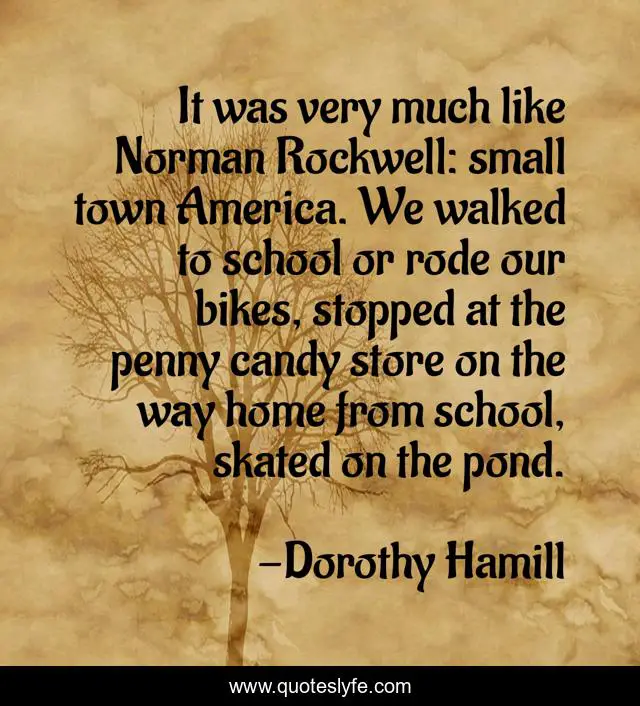 This page presents the quote "It was very much like Norman Rockwell: small town America. We walked to school or rode our bikes, stopped at the penny candy store on the way home from school, skated on the pond.". Author of this quote is Dorothy Hamill. This quote is about small, school, america,.