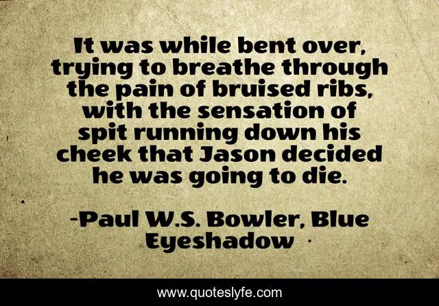 This page presents the quote "It was while bent over, trying to breathe through the pain of bruised ribs, with the sensation of spit running down his cheek that Jason decided he was going to die.". Author of this quote is Paul W.S. Bowler, Blue Eyeshadow. .