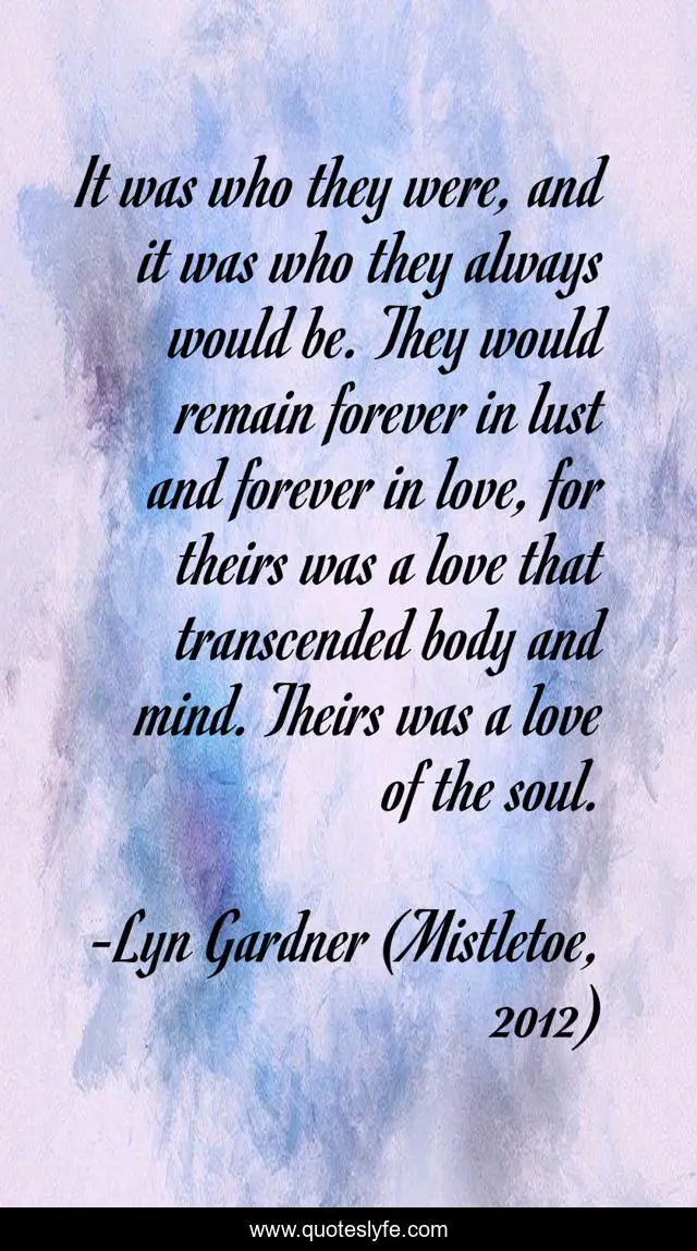 This page presents the quote "It was who they were, and it was who they always would be. They would remain forever in lust and forever in love, for theirs was a love that transcended body and mind. Theirs was a love of the soul.". Author of this quote is Lyn Gardner (Mistletoe, 2012). This quote is about quotes, quotes-about-love,.