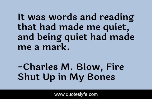 This page presents the quote "It was words and reading that had made me quiet, and being quiet had made me a mark.". Author of this quote is Charles M. Blow, Fire Shut Up in My Bones. This quote is about quietness, introverts, reading, victims, words,.