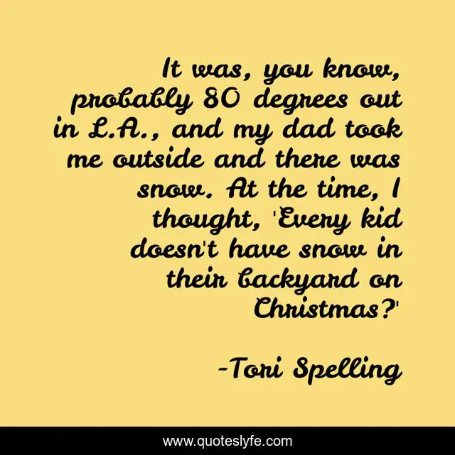This page presents the quote "It was, you know, probably 80 degrees out in L.A., and my dad took me outside and there was snow. At the time, I thought, 'Every kid doesn't have snow in their backyard on Christmas?'". Author of this quote is Tori Spelling. This quote is about thought, me, time,.