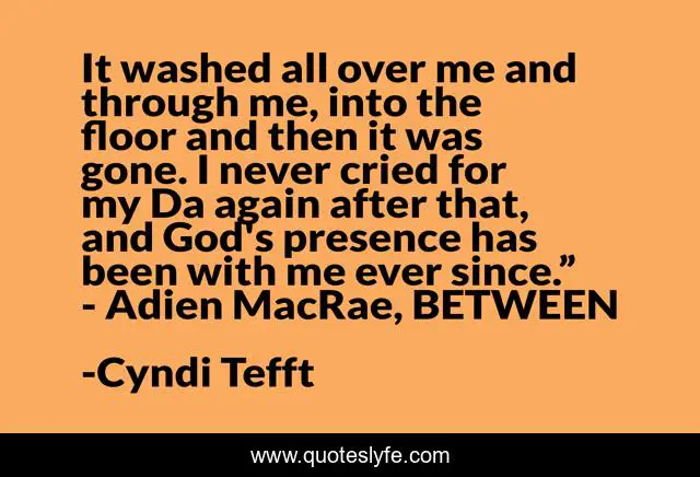 This page presents the quote "It washed all over me and through me, into the floor and then it was gone. I never cried for my Da again after that, and God's presence has been with me ever since.” - Adien MacRae, BETWEEN". Author of this quote is Cyndi Tefft. This quote is about romance, ya, scotland, paranormal, kilt,.
