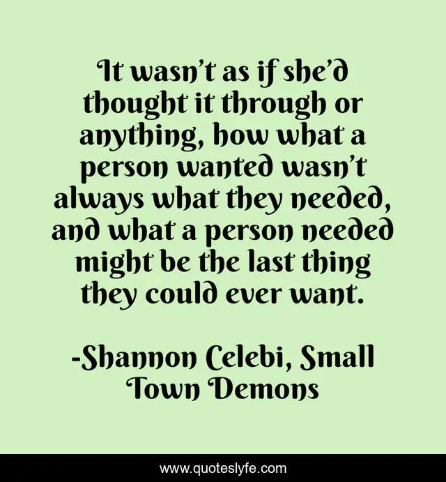 This page presents the quote "It wasn’t as if she’d thought it through or anything, how what a person wanted wasn’t always what they needed, and what a person needed might be the last thing they could ever want.". Author of this quote is Shannon Celebi, Small Town Demons. This quote is about needs, wanting-what-you-can-t-have, shannon-celebi, needing, small-towns, neediness, small-town-demons, wanting-something, wanting,.