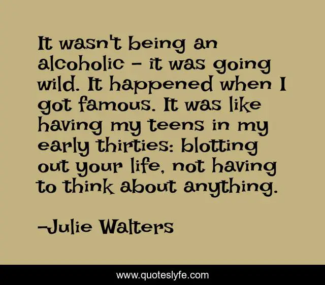 This page presents the quote "It wasn't being an alcoholic - it was going wild. It happened when I got famous. It was like having my teens in my early thirties: blotting out your life, not having to think about anything.". Author of this quote is Julie Walters. This quote is about early, life, think,.