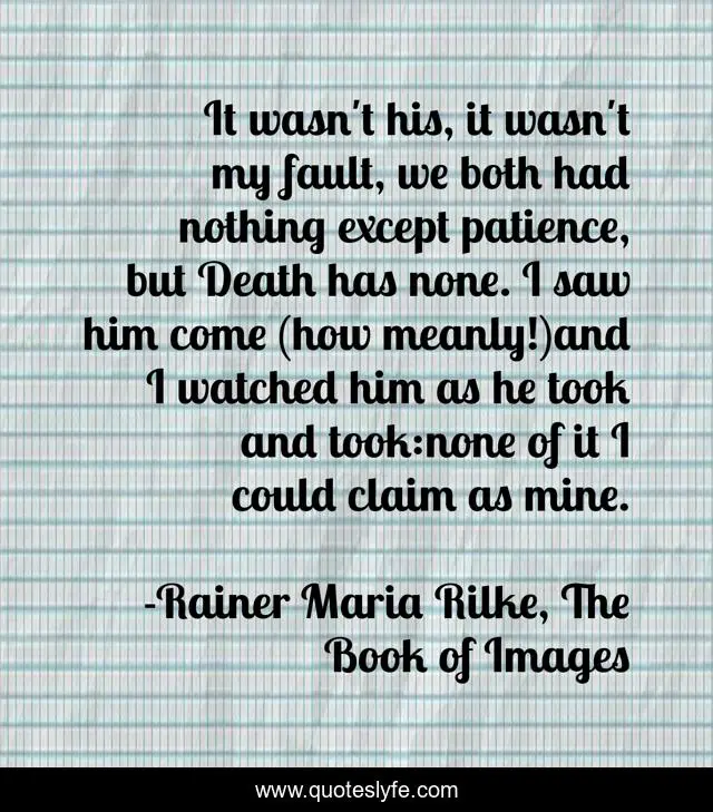 This page presents the quote "It wasn't his, it wasn't my fault, we both had nothing except patience, but Death has none. I saw him come (how meanly!)and I watched him as he took and took:none of it I could claim as mine.". Author of this quote is Rainer Maria Rilke, The Book of Images. .