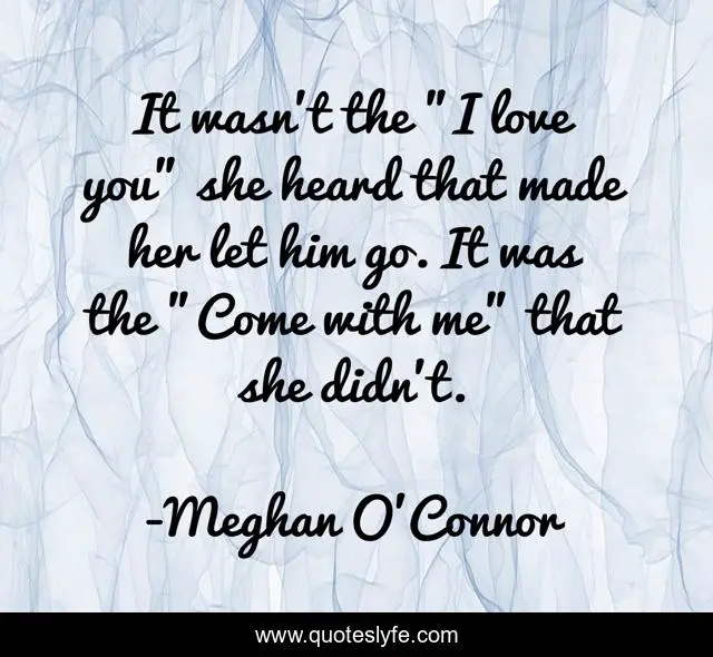 This page presents the quote "It wasn't the "I love you" she heard that made her let him go. It was the "Come with me" that she didn't.". Author of this quote is Meghan O'Connor. This quote is about drama, relationships, heartbreak, tragedy,.
