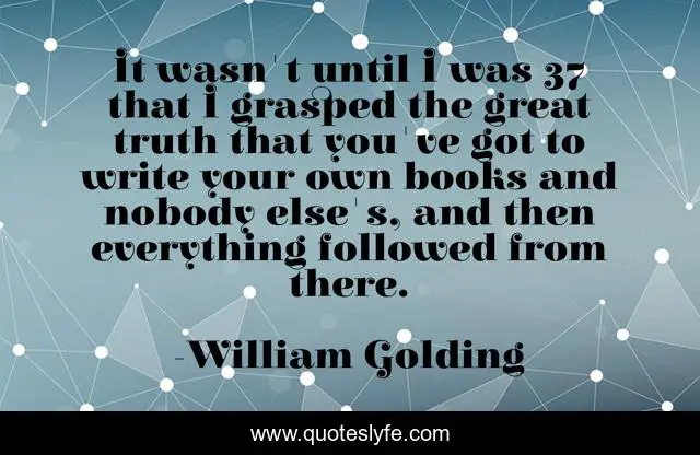 This page presents the quote "It wasn't until I was 37 that I grasped the great truth that you've got to write your own books and nobody else's, and then everything followed from there.". Author of this quote is William Golding. This quote is about individuality, later-in-life, truth, writing,.