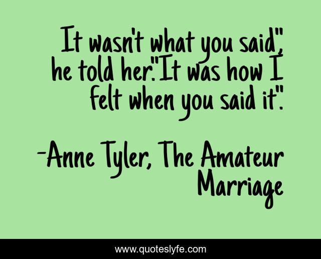 This page presents the quote "It wasn't what you said", he told her."It was how I felt when you said it".". Author of this quote is Anne Tyler, The Amateur Marriage. .
