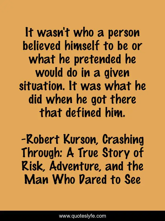 This page presents the quote "It wasn't who a person believed himself to be or what he pretended he would do in a given situation. It was what he did when he got there that defined him.". Author of this quote is Robert Kurson, Crashing Through: A True Story of Risk, Adventure, and the Man Who Dared to See. .