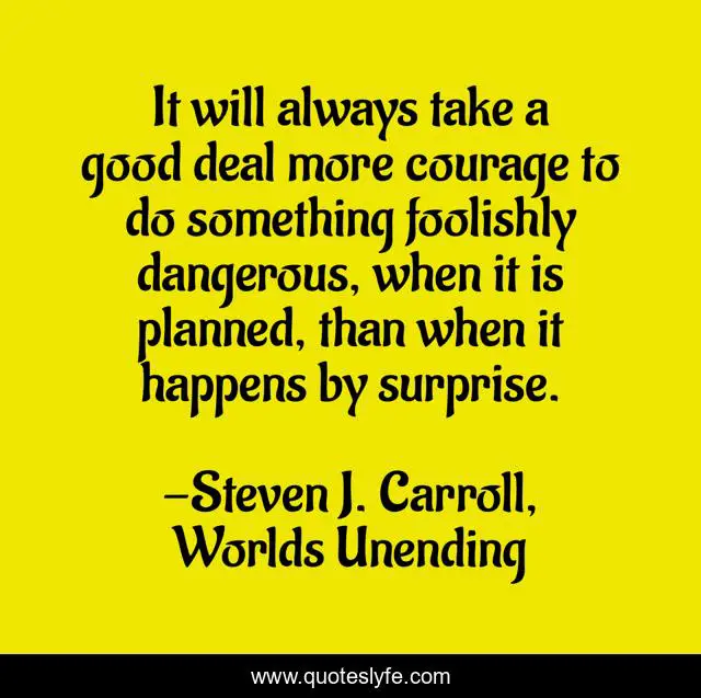 This page presents the quote "It will always take a good deal more courage to do something foolishly dangerous, when it is planned, than when it happens by surprise.". Author of this quote is Steven J. Carroll, Worlds Unending. This quote is about surprise, planning, foolish, bravery, danger,.