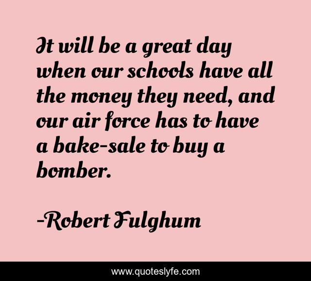 This page presents the quote "It will be a great day when our schools have all the money they need, and our air force has to have a bake-sale to buy a bomber.". Author of this quote is Robert Fulghum. This quote is about great, air force, day,.