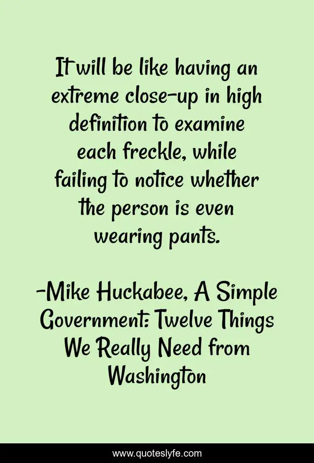 This page presents the quote "It will be like having an extreme close-up in high definition to examine each freckle, while failing to notice whether the person is even wearing pants.". Author of this quote is Mike Huckabee, A Simple Government: Twelve Things We Really Need from Washington. This quote is about politics, humor,.