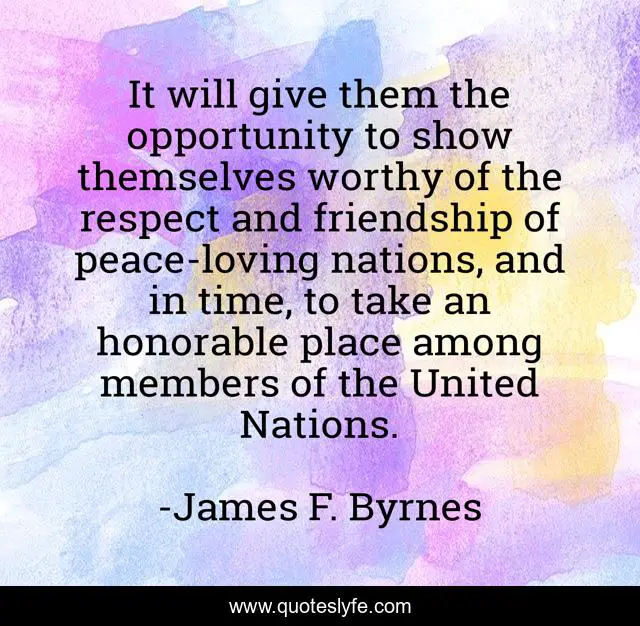 This page presents the quote "It will give them the opportunity to show themselves worthy of the respect and friendship of peace-loving nations, and in time, to take an honorable place among members of the United Nations.". Author of this quote is James F. Byrnes. This quote is about respect, opportunity, time,.