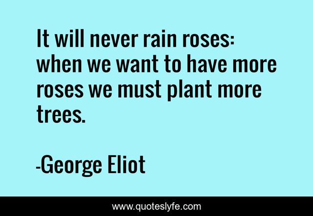 This page presents the quote "It will never rain roses: when we want to have more roses we must plant more trees.". Author of this quote is George Eliot. This quote is about roses, rain, trees,.