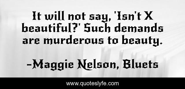 This page presents the quote "It will not say, 'Isn't X beautiful?' Such demands are murderous to beauty.". Author of this quote is Maggie Nelson, Bluets. .