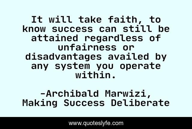 This page presents the quote "It will take faith, to know success can still be attained regardless of unfairness or disadvantages availed by any system you operate within.". Author of this quote is Archibald Marwizi, Making Success Deliberate. This quote is about life, success, behaviour, attitude, legacy, growth, purpose, inspirational, leadership,.
