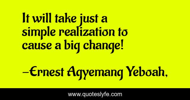 This page presents the quote "It will take just a simple realization to cause a big change!". Author of this quote is Ernest Agyemang Yeboah,. This quote is about realities-of-life, deception, shift, small-things, realization, common-sense,.