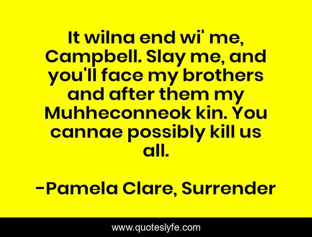 "Pamela Clare, Surrender Quotes." Quoteslyfe.com, 2025. Fri. 05 Dec. 2025. <https://www.quoteslyfe.com/quote/It-wilna-end-wi-me-Campbell-Slay-213822>.