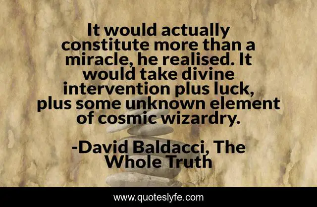 This page presents the quote "It would actually constitute more than a miracle, he realised. It would take divine intervention plus luck, plus some unknown element of cosmic wizardry.". Author of this quote is David Baldacci, The Whole Truth. This quote is about funny, divine, shaw, miracle, books, truth, comedy, whole,.