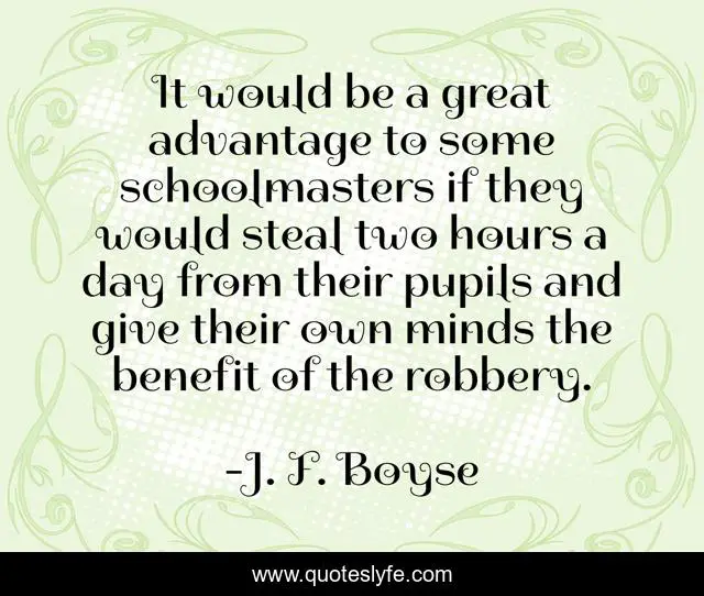 This page presents the quote "It would be a great advantage to some schoolmasters if they would steal two hours a day from their pupils and give their own minds the benefit of the robbery.". Author of this quote is J. F. Boyse. This quote is about teaching, teachers,.