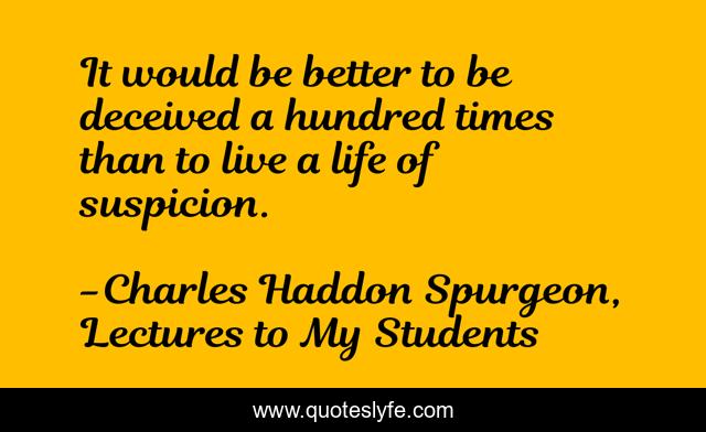 This page presents the quote "It would be better to be deceived a hundred times than to live a life of suspicion.". Author of this quote is Charles Haddon Spurgeon, Lectures to My Students. This quote is about openness, defensiveness, paranoia, humility,.