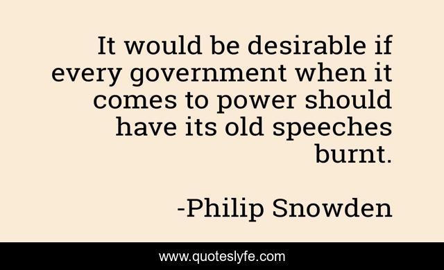 This page presents the quote "It would be desirable if every government when it comes to power should have its old speeches burnt.". Author of this quote is Philip Snowden. This quote is about rule, government,.
