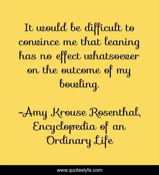 This page presents the quote "It would be difficult to convince me that leaning has no effect whatsoever on the outcome of my bowling.". Author of this quote is Amy Krouse Rosenthal, Encyclopedia of an Ordinary Life. This quote is about bowling, leaning, beliefs, sports,.