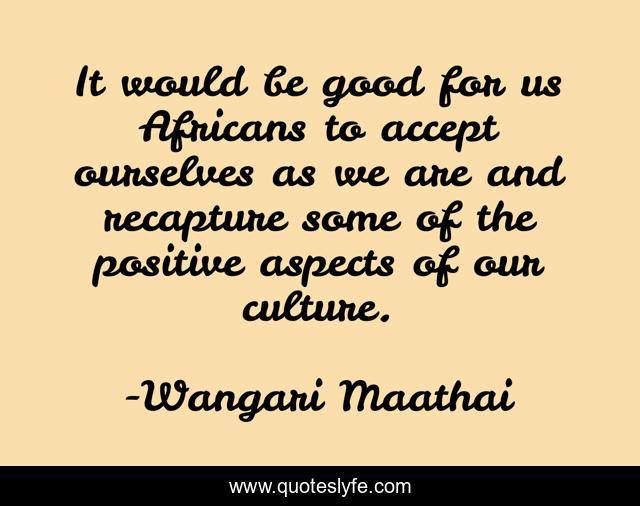 This page presents the quote "It would be good for us Africans to accept ourselves as we are and recapture some of the positive aspects of our culture.". Author of this quote is Wangari Maathai. This quote is about culture, good, accept,.
