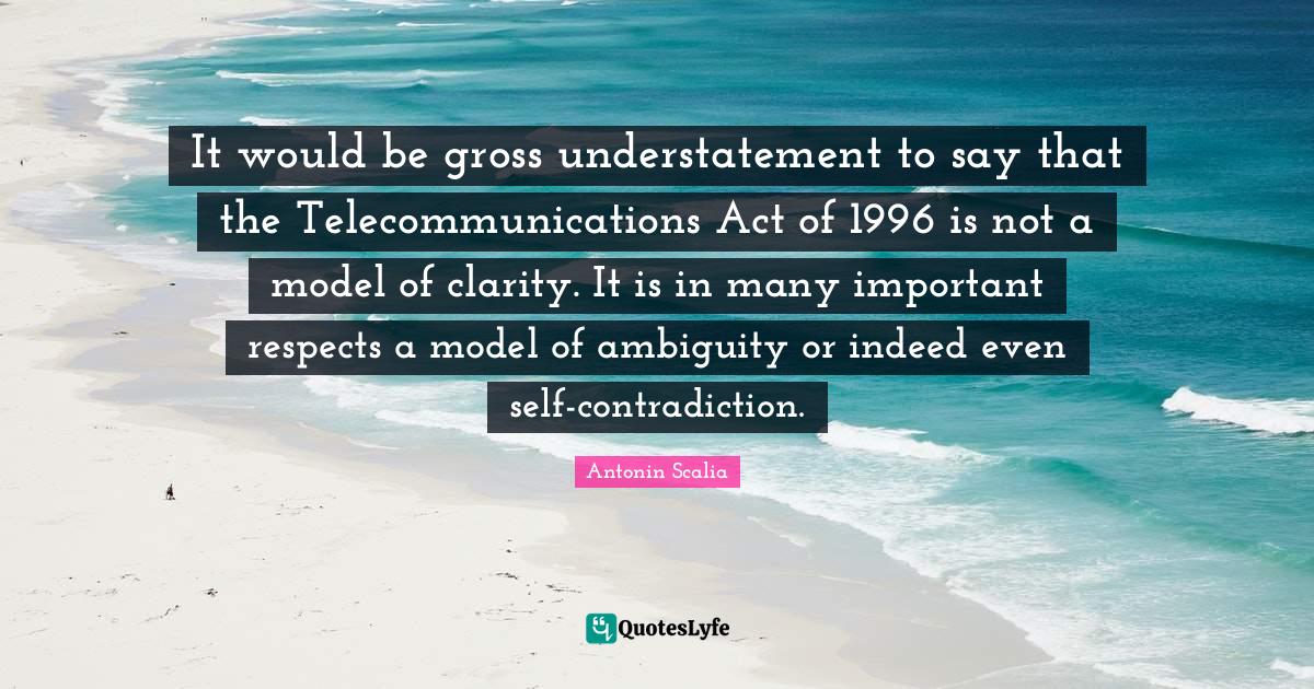 This page presents the quote "It would be gross understatement to say that the Telecommunications Act of 1996 is not a model of clarity. It is in many important respects a model of ambiguity or indeed even self-contradiction.". Author of this quote is Antonin Scalia. This quote is about important, would be, understatement, contradiction, gross, clarity, self, ambiguity,.